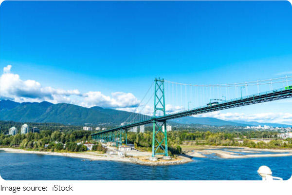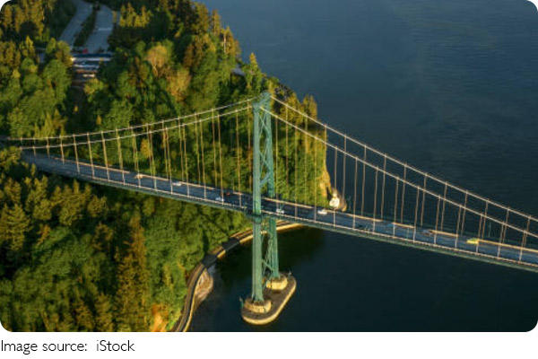 The Lions Gate Bridge, an iconic suspension bridge in Vancouver, Canada, spans the Burrard Inlet, connecting the bustling city with the serene landscapes of North and West Vancouver.