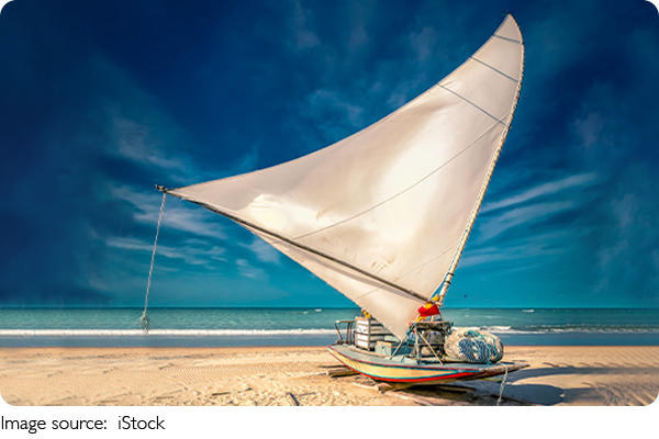 Lay the sail out flat on deck and set it into the boom. Extend it from the boom and pull it tight for battens insertion. These are thin lengths of plastic or wood that give structure to your sail for windy conditions. Insert battens into their pockets starting at the bottom of the sail. Congratulations! Your sail is now stiffened and ready for strong coastal winds.