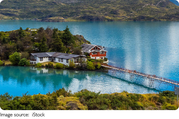 This serene island offers a perfect escape from the hustle of daily life. The calm waters, vibrant green vegetation, and distant views of the Andes Mountains create a peaceful retreat.