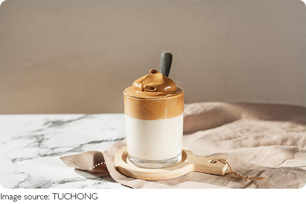 2. Pour iced milk into a steel cup, add condensed milk, and stir well. Use a steam pipe on your coffee machine or a frother to make milk froth at about 55-65 degrees Celsius.