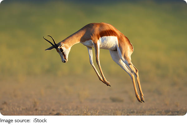Одной из самых уникальных особенностей спрингбока является его способность к "пронкингу" — это высокие вертикальные прыжки, во время которых антилопа выгибает спину и подскакивает на несколько метров в воздух. Способность спрингбока к прыжкам помогает ему убегать от хищников и одновременно сигнализирует об опасности другим особям, а когда все стадо прыгает вместе, это создает завораживающее зрелище, похожее на танец.