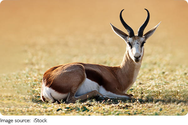 Однако спрингбок отлично приспособился к жизни в этих условиях, умея долго обходиться без воды. Он получает необходимую влагу из пищи, такой как трава, листья и некоторые виды кактусов.