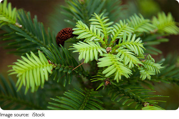The leaves grow in two rows along the branches. They are slightly curved and have edges that may be rolled backward. The fir tree is evergreen, with flowers that bloom in May and cones maturing by October. The cones are oval or cylindrical, turning dark black or pale blue-black when ripe.