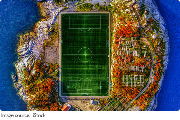 Football is played on a rectangular field, which can either be natural grass or artificial turf. The field's dimensions are regulated: the length is between 90 to 120 meters, and the width is between 45 to 90 meters. At the center of the field is the half-way line, dividing the pitch into two equal halves.