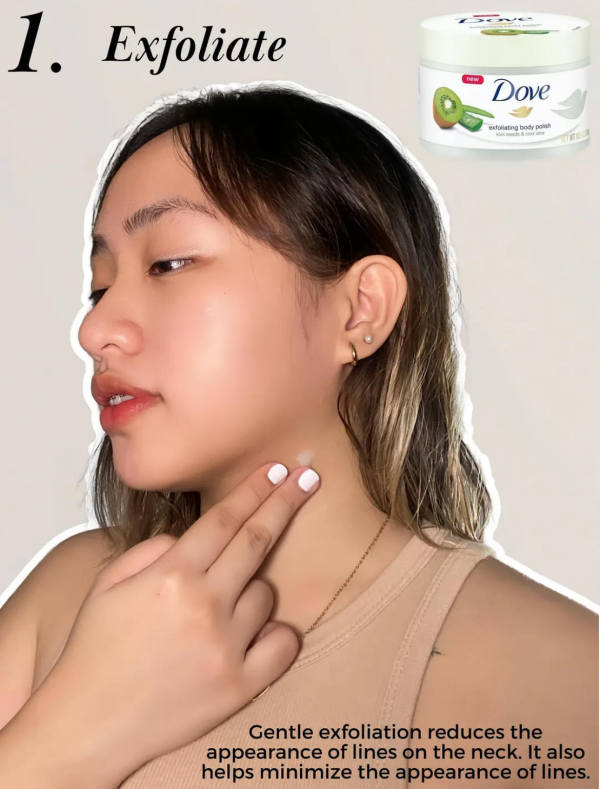 Using a mild exfoliant on your neck can slough away dead skin cells and improve skin texture. Regular exfoliation also helps your skincare products absorb better and can soften the look of existing lines.