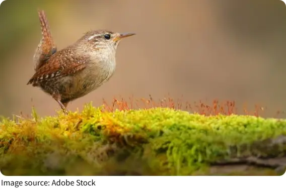 The Eurasian wren is one of the smallest birds in Europe, measuring about 9 to 10 cm (3.5 to 4 inches) in length, with a wingspan of 15 to 20 cm. Despite its size, the wren is often noticed for its energetic movements and loud song, which seems to echo well beyond its tiny form. The wren has a brown, streaky body with a distinctive upright tail, which is often held cocked upwards, making it instantly recognizable.