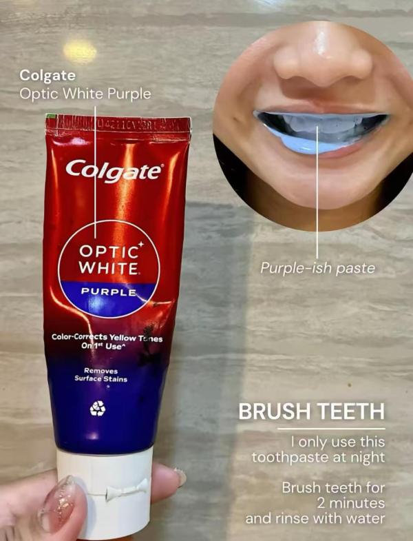 Each night, brush your teeth for two full minutes. I use a purple formula from Colgate's Optic White line to help remove surface stains.