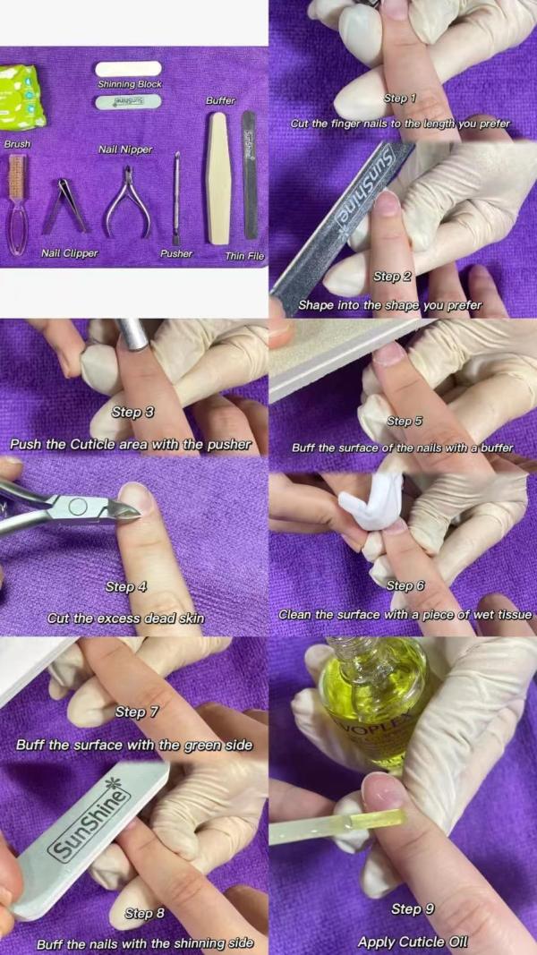 Nail clipper, nail nipper, cuticle pusher, nail buffer, thin file, brush, shining block, and wet wipes.
