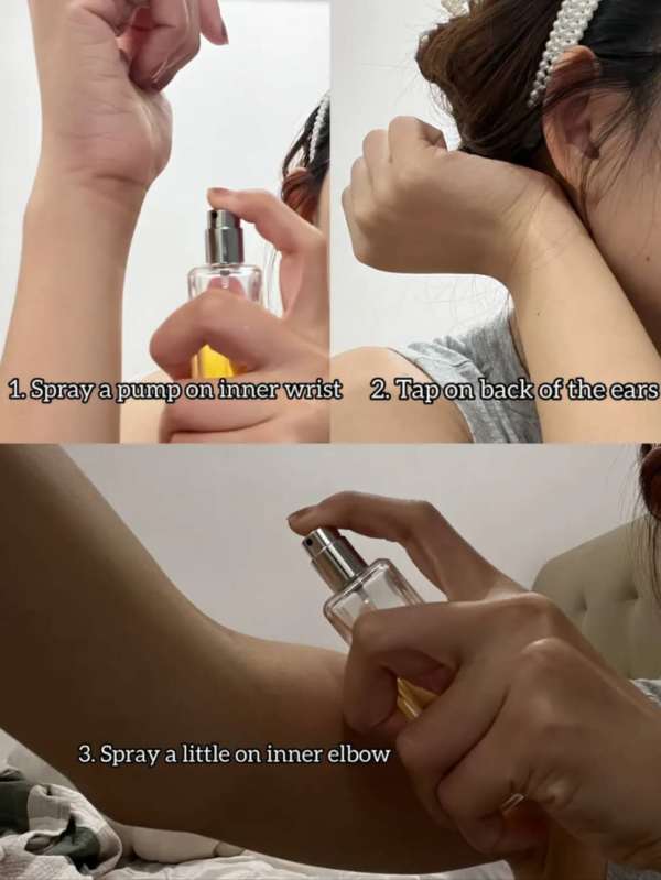 - Spray on inner wrists and gently tap behind ears