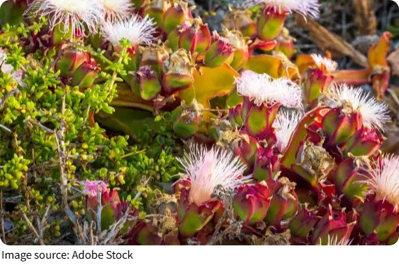 Although the ice plant is native to arid regions, it has gained popularity in gardens and landscapes around the world. Its unique appearance and hardiness make it an attractive addition to rock gardens, xeriscapes, and low-water landscaping projects. It's especially valued in areas where drought tolerance is important, as it requires minimal watering once established.