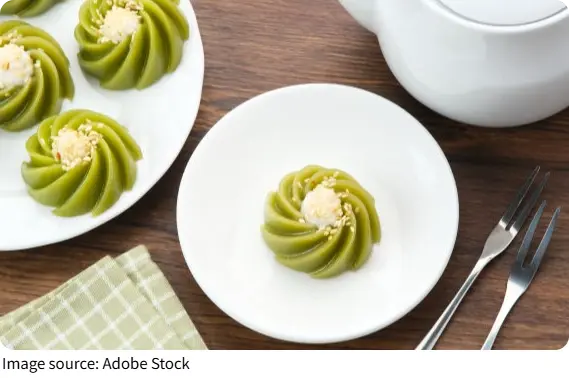 This kuih is a traditional Southeast Asian steamed dessert made by layering two naturally green batters: pandan, which gives a floral and slightly nutty taste, and matcha, adding a touch of bitterness that balances the sweetness. Together, they create a chewy, jiggly, slightly sticky dessert with a beautiful contrast in flavor and color. The fun part? We peel it and eat it with our fingers—layer by layer.