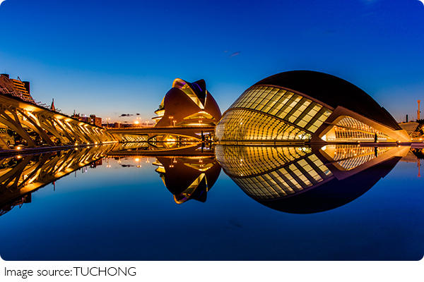 - L'Hemisfèric – A building shaped like an eye, complete with a moving eyelid. At night, its reflection in the water forms a perfect ellipse, glowing like a mystical portal.