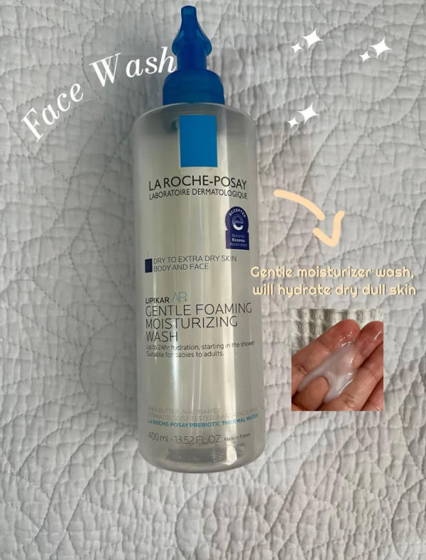 Start with a hydrating foaming cleanser that’s specially made for dry and sensitive skin. Choose one packed with nourishing ingredients like shea butter, glycerin, and niacinamide to gently cleanse without stripping moisture. Look for formulas that also contain prebiotic thermal water to help soothe and soften right from the shower.
