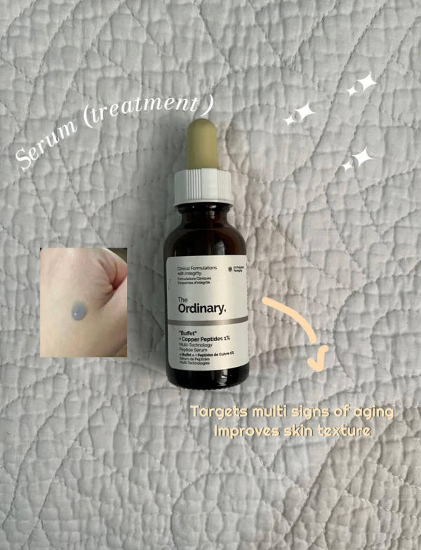 Next, apply a peptide-rich serum to boost firmness and smoothness. Products with copper peptides work on multiple signs of aging, supporting the skin’s elasticity and improving the appearance of fine lines and uneven skin tone.