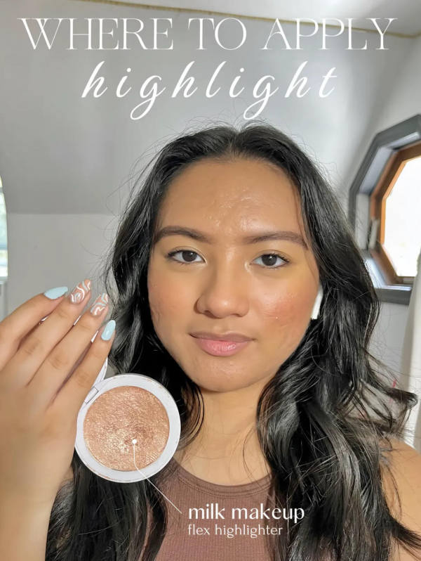 Personally, I like to apply highlighter to the high points of my face—any spot where light naturally hits or where I want to draw a little extra attention. One of my go-to products is the Flex Highlighter from Milk Makeup in the shade “Blitzed.” It’s been a favorite for a long time, and even after countless uses, it’s still going strong!