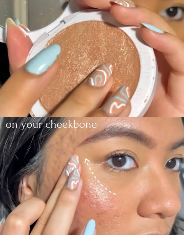 I usually start by tapping highlighter onto my cheekbones using my fingertips. This helps build a radiant, natural-looking shine.