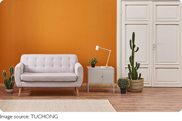 The same goes for color. If your furniture is neutral, add interest with a pop of color in your rug, pillows, or artwork.