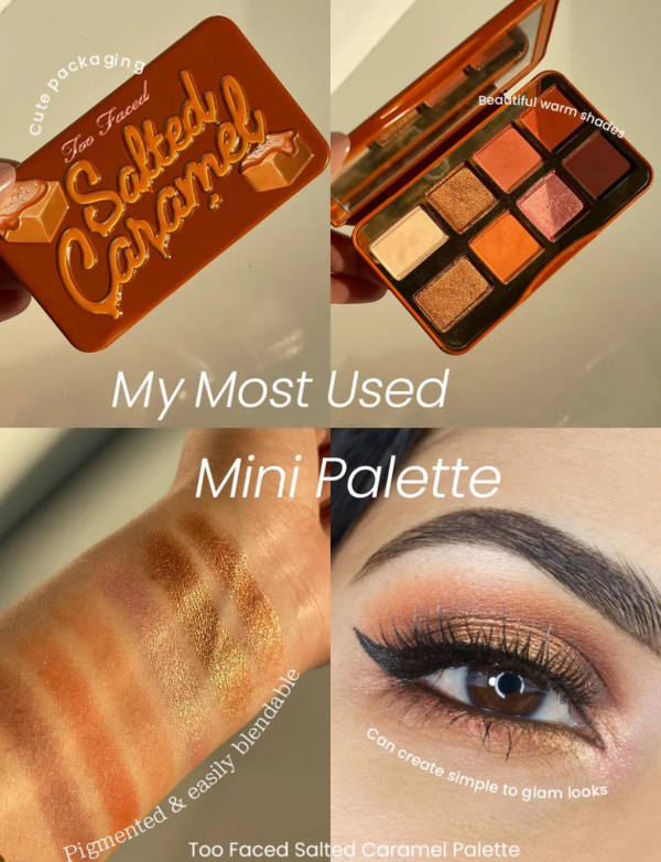 One standout is the Too Faced Salted Caramel Palette. This mini gem has the perfect balance of warmth and neutral tones. The shadows blend effortlessly, build beautifully, and coordinate in a way that makes it easy to go from a soft daytime look to something more glamorous.