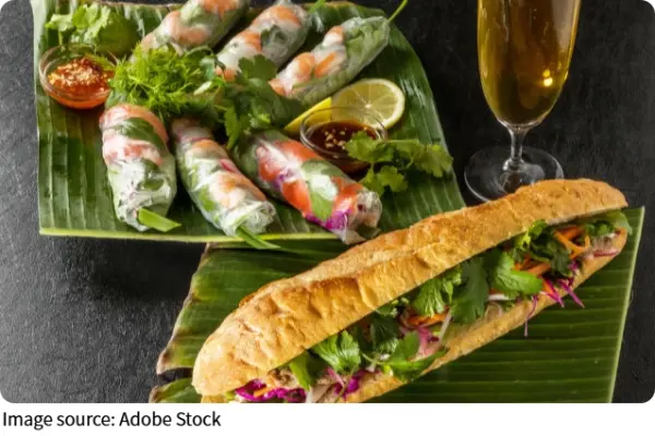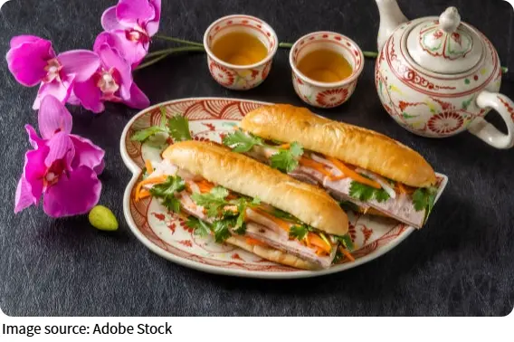 Bánh Mì is a famous Vietnamese sandwich that combines a light, crispy baguette with marinated meat, tangy pickled vegetables, and fresh herbs.
