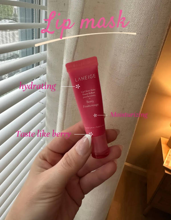 This lip mask is a staple in my nighttime routine. It smells like fresh berries and gives a pretty pink glow while locking in moisture. The formula is smooth and never sticky, and I always wake up with softer lips after using it. It also works great during the day if you want a natural-looking shine!