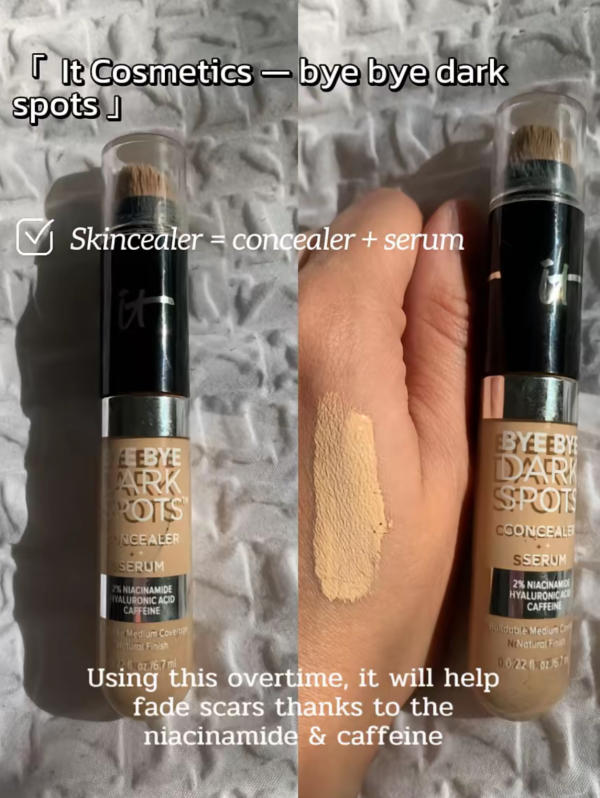 This hybrid product is part concealer and part serum. Infused with niacinamide and caffeine, it helps reduce dark spots while also working as coverage for blemishes or under-eye circles. With consistent use, it provides both an instant brightening effect and long-term skin benefits.