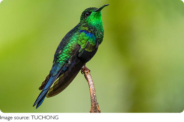 Found mainly in Central and South America, it thrives in tropical forests, gardens, and areas with plenty of flowering plants. Its vivid green plumage blends beautifully with leaves, yet sparkles in the light, making it both a master of camouflage and a dazzling spectacle for us to observe.