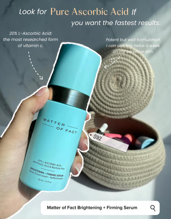 Here’s where things get serious—this serum uses pure ascorbic acid at 20%. It’s the gold standard of Vitamin C, offering the fastest and most dramatic results in terms of brightness and firmness. The trade-off? It’s also the most irritating if your skin isn’t used to it. The Matter of Fact formula is well-balanced, making it gentler than many pure Vitamin C serums on the market. Still, if you’re new to Vitamin C, start with a derivative before working your way up to this powerhouse.