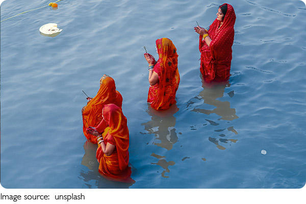 3. Sandhya Arghya (Evening Offering) – Devotees stand in water at sunset to offer arghya to the setting Sun, singing folk songs and performing prayers.