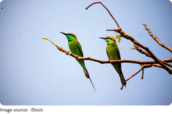 When perched, the Green Bee-Eater looks both delicate and purposeful. It usually chooses thin branches, low shrubs, or exposed twigs, keeping its elongated central tail feathers neatly aligned. Sunlight brings out its bright green feathers, which shimmer with subtle blue highlights. The golden-reddish crown and blue-green throat stand out vividly, making the bird easy to spot even from a distance.