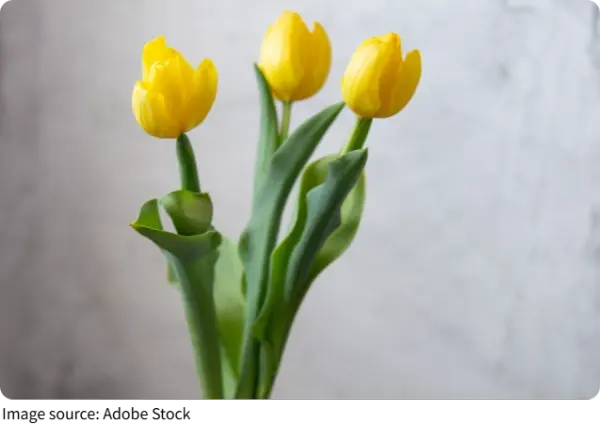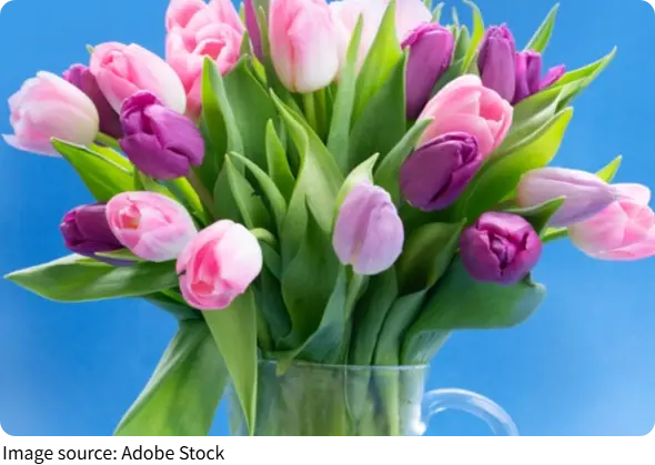 Tulips also continue to grow even after they’re cut, so they’ll move and bend gracefully over time, giving the bouquet a dynamic, living shape. For vases, clear glass works best, letting the green stems show through for a clean and refreshing effect. Changing the water every two days keeps the flowers fresh and vibrant for longer.