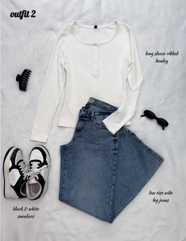 For a slightly cozier look, swap the tee for a ribbed long-sleeve Henley top. It’s comfy, flattering, and ideal for cooler days. Pair it again with those wide-leg jeans and chunky sneakers to keep things balanced and trendy. Add a crossbody bag or layered necklaces for that effortlessly styled touch.