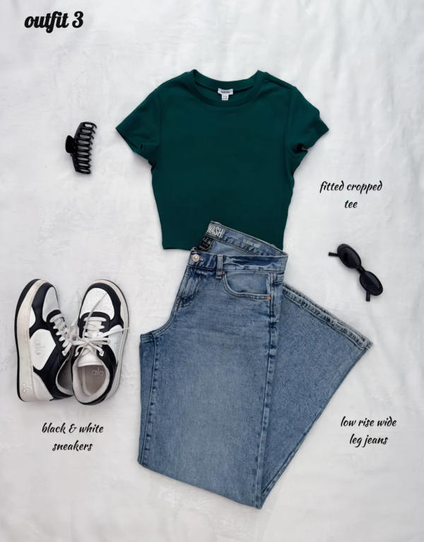 This outfit keeps things classic but flattering. A cropped fitted tee gives a clean, sleek silhouette that pairs perfectly with wide-leg jeans for contrast. Throw on your favorite sneakers and accessorize with hoops, a cap, or even a tote bag — whatever makes you feel confident and stylish.