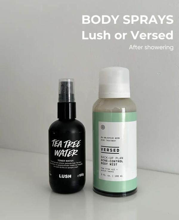 After showering, spritz your damp or dry skin with a tea tree or acne-fighting body spray. Let it fully dry before applying lotion. These sprays help calm inflammation and prevent new breakouts.