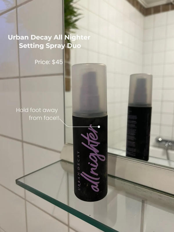 Mist the face with Urban Decay All Nighter Setting Spray Duo and allow it to dry. This seals the powder and primer together, locking in moisture and makeup.