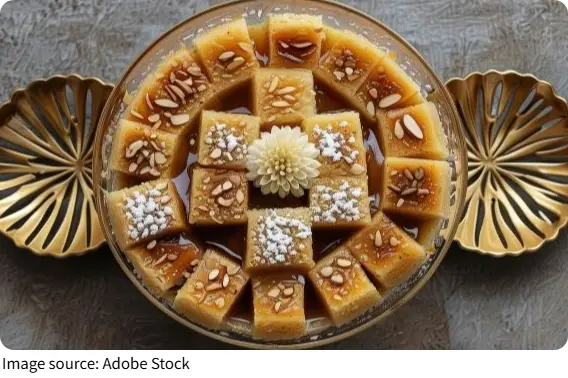 Basbousa is a traditional Middle Eastern semolina cake that’s soft, slightly grainy, and soaked in fragrant syrup. It’s sweet but not overwhelming, with a buttery flavor and a subtle hint of rose or orange blossom water.