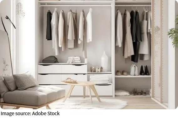 We can make the shoe section a true centerpiece of the room by treating shoes as decorative items. Arranging them by height, material, or color creates a neat visual effect. A few special pairs can be displayed on open shelves like art pieces. Soft rugs placed below the display area and a clean bench complete the look, making the whole room feel like a curated style corner. This turns our changing room into a space that expresses our taste, not just a place to store belongings.