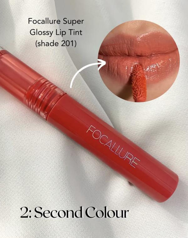 Next, I apply Focallure Super Glossy Tint in shade 201 slightly toward the inner part of the lips. This shade acts as the bridge between the base and the center color. It also adds a glossy finish that makes the lips look healthy and plump. The shine helps everything melt together smoothly, so there are no harsh lines.