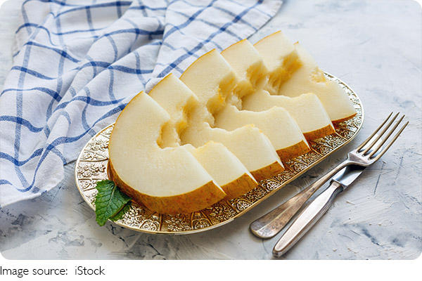 This winter melon has a thick rind and pale green, sweet flesh. Its firm texture makes it perfect for slicing, and it keeps its flavor longer when stored in the fridge, making it ideal for summer snacks.
