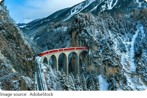 The easiest way to reach the Landwasser Viaduct is by train through the Rhaetian Railway (RhB).