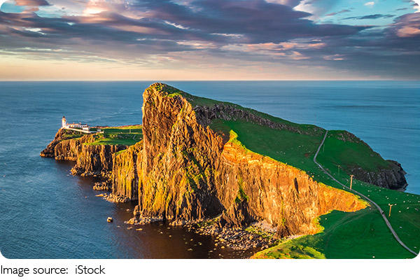 Neist Point sits at the western edge of the Isle of Skye, where cliffs drop sharply into the North Atlantic. The lighthouse at the end of the headland looks small against the surrounding rock, which gives you an immediate sense of depth and exposure.