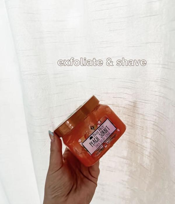 Next, I go in with Tree Hut Shea Sugar Scrub. This is what gives that soft, glowing look. I gently massage it onto damp skin, especially on areas that need extra smoothing. After rinsing, my skin feels polished and ready for lotion. This step makes everything feel elevated.
